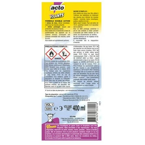 L’ insecticide aĂ©rosol insectes volants – 400 mL de la marque ACTO lutte efficacement contre les insectes volants. Cet insecticide est spĂ©cialement conçu pour Ă©radiquer les mouches,les moustiques, les taons, les guĂŞpes, les papillons de nuit, etc, efficacement et rapidement.