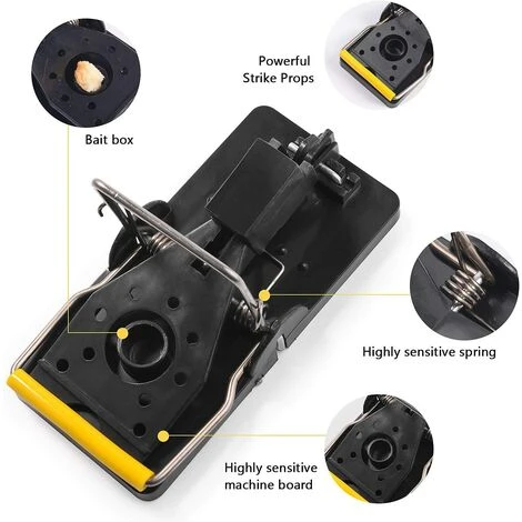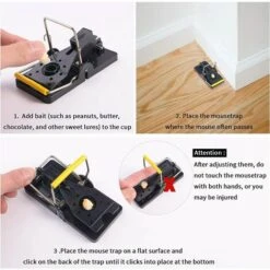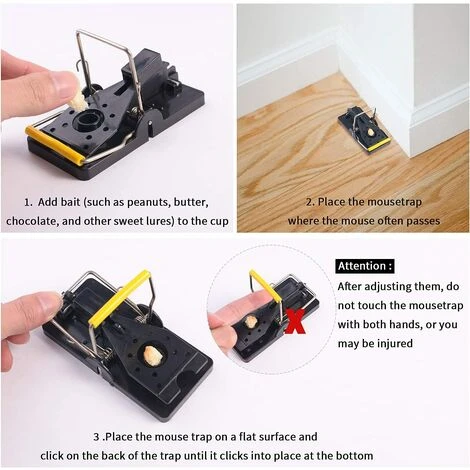 Facile à utiliser : Placez l’appât(il vaut mieux utiliser le beurre d’arachide) dans la tasse d’appât préparée, puis verrouillez la barre en métal sur le socle arrière. Puis, placez ce produit dans des coins que les souris fréquentent.