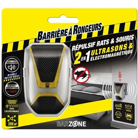 - Contenu : 1 x RĂ©pulsif 2 en 1 Ultrasons & ElectromagnĂ©tiques Rats et Souris – Blister de 1 Appareil BARZONE BARRIERE A RONGEURS, Dimensions (L x P x H): 20,2 x 8 x 18, BARSONICMAX