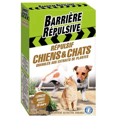RĂ©pulsif chiens chats granulĂ©s prĂŞts Ă l’emploi 400g /nc de la marque BARRIERE REPULSIVE.. Etui 2 sachets 200g. RĂ©pulsif sous forme de granulĂ©s Ă base de GĂ©raniol qui permet d’Ă©loigner les chiens et les chats des zones Ă protĂ©ger. Lutte efficacement contre les nuisances occasionnĂ©es par ces animaux domestiques.Longue durĂ©e d’action, jusqu’Ă 30 jours selon les conditions climatiques.
