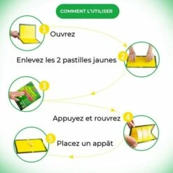 (Très pratique) Ce piège Ă rongeurs et autres insectes est très facile Ă mettre en place. Ouvrez le carton, enlevez les deux boutons jaunes, fermez et appuyez sur le carton puis rĂ©ouvrez. Enfin posez le sur un lieu de passage des rongeurs et mettez unappât dessus pour plus d’efficacitĂ©. Votre travail s’arrĂŞte lĂ et vous n’avez plus qu’à attendre que le piège fasse effet.