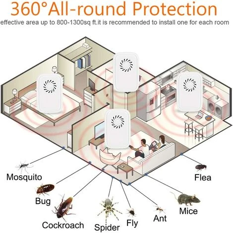 - Large zone de couverture: – Le rĂ©pulsif ultrasonique fonctionne sur une superficie de 80 Ă 120 mètres carrĂ©s, mais les ultrasons ne pĂ©nètrent pas dans les murs. Nous vous recommandons d’utiliser au moins 1 appareil par pièce. Le rĂ©pulsif ultrasonique est idĂ©al pour les maisons, les bureaux, les garages, les greniers, les sous-sols, les entrepĂ´ts et les serres.