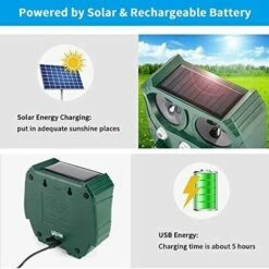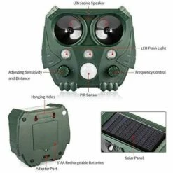 RĂ©pulsif Ă ultrasons Ă Ă©nergie solaire – Effarez les chats ou d’autres animaux tels que les chiens, renards, martres, ratons laveurs, rats, souris, blaireaux, mouffettes, sangliers, chauves-souris, oiseaux, pigeons, rongeurs, etc. grace Ă des ondes sonores puissantes et automatiques dans la zone ultrasonique et clignotantes LED clignotantes lorsque le dĂ©tecteur de mouvement infrarouge PIR les dĂ©tectent la dĂ©tectent Totalement inoffensif pour les humains et les animaux. !