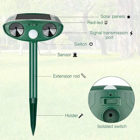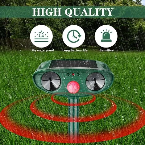 【Sûr et respectueux de l’environnement】Le répulsif à ultrasons pour animaux dissuade les animaux intrus avec des ultrasons et une lumière rouge, sans danger pour eux, sans animaux morts. Le répulsif solaire pour animaux ne contient ni produits chimiques ni pesticides, sans danger pour les humains et les animaux domestiques.