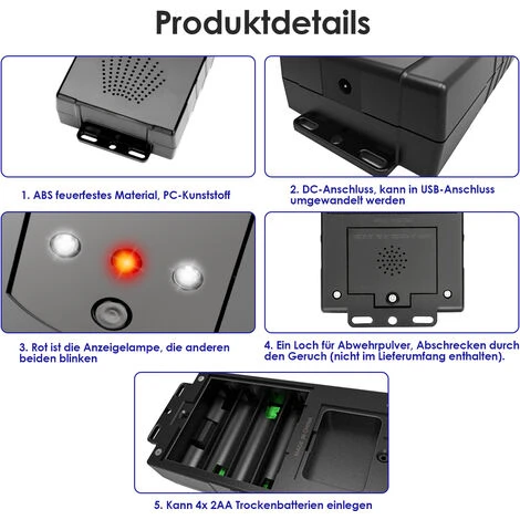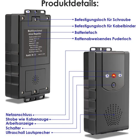 ăMĂ©thode triple rĂ©pulsif pour sourisă Ultrasons + Flash + Insectifuge. La frĂ©quence est continuellement modifiĂ©e Ă l’aide d’ultrasons, qui stimulent et dĂ©truisent le cerveau et le systĂšme auditif de la souris, la lumiĂšre clignotante et la combinaison de poudre rĂ©pulsive (non incluse) font que la souris se sent paniquĂ©e, apathique et s’Ă©chappe de l’appartement.