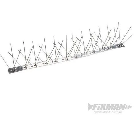 Barrettes et pics en acier inoxydable. Se fixent par vissage sur le bois ou le béton grâce aux trous prépercés, ou sur le plastique avec du ruban adhésif double face ou de la colle spéciale (non fournis). Empêchent les oiseaux de se poser sur les bâtiments ou les clôtures. Largeur 50 mm. Longueur des pics : 105 mm.