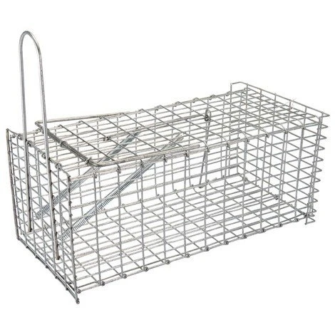 Cage avec grillage galvanisé et action par ressort. Permet de capturer les rats sans les blesser ni les tuer pour pouvoir les relâcher dans un endroit plus propice. Réutilisable.