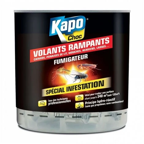 Grâce à son action radicale et longue durée, le Fumigateur détruit les insectes rampants (blattes, cafards, puces, punaises…), et volants (guêpes, mouches, mites…), larves, acariens… Il traite dans sa totalité un volume de 135 m² (soit une surface de 340 m³)