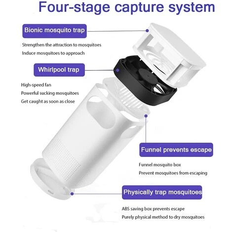 3.When the mosquito is sucked into the mosquito tray, it is difficult for the mosquito to escape. It has been trapped by the strong vortex into the mosquito tray. The fan keeps rotating and make the mosquito dehydrated and died.