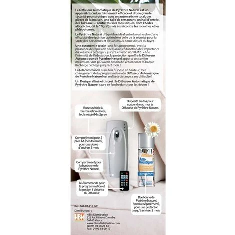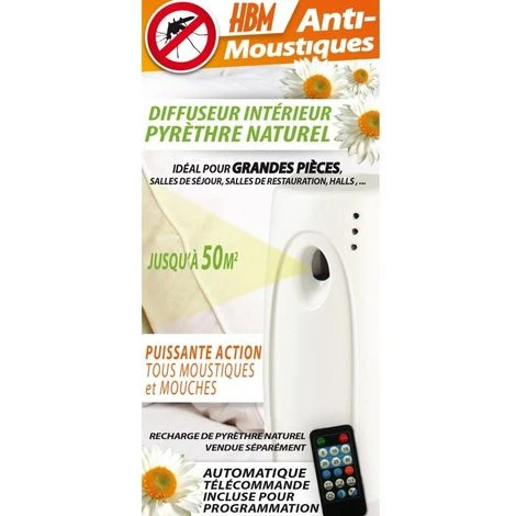 Diffuseur anti moustique et anti mouche interieur très efficace Permet une protection radicale sur une surface de 40 à 50 mètres carrés Diffuseur automatique programmable avec télécommande Recommandé pour les grandes pièces de la maison, les bureaux, les halls d’entrée, les restaurants… Produit actif anti mouche et anti moustique naturel à base de Pyrèthre végétal Sans danger pour l’être humain et les animaux domestiques mais radical contre les nuisibles Utilisation du diffuseur anti moustique et anti mouche interieur : Ce produit a été conçu pour tous ceux qui ne souhaitent plus être esclaves des produits anti moustique inefficaces. Avec ce diffuseur anti mouche et anti moustique automatique et programmable, votre espace de vie sera en permanence protégé contre ces nuisibles. Programmation facile et rapide, qui s’adapte à vos besoins pour sécuriser près de 50 mètres carrés de surface.