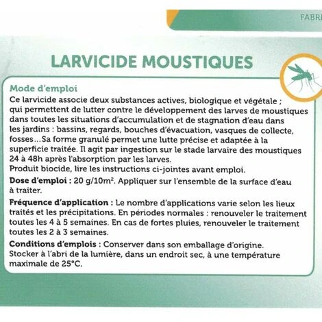 - Efficace contre le développement des larves de tous les moustiques communs (y compris moustiques tigres) dans les eaux calmes : bassins, réservoirs, soucoupes, etc.