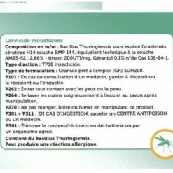 - ComposĂ© d’une bactĂ©rie prĂ©datrice, il Ă©limine l’intĂ©gralitĂ© des larves de moustiques et empĂŞche les pontes successives.