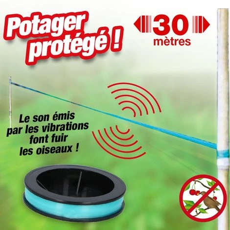 Ruban dissuasif oiseaux longueur 30m, largeur 6mm. Positionnez ce ruban au-dessus des semis, des gazons fraĂ®chement semĂ©s ou au-dessus de l’Ă©tang et dissuadez de cette façon les oiseaux de s’approcher. Dès qu’il est resserrĂ© et que le vent se lève, ce ruban fait un dĂ©sagrĂ©able bruit vibrant qui apeure les oiseaux. C’est Ă©galement un produit optimal pour protĂ©ger les arbres fruitiers.