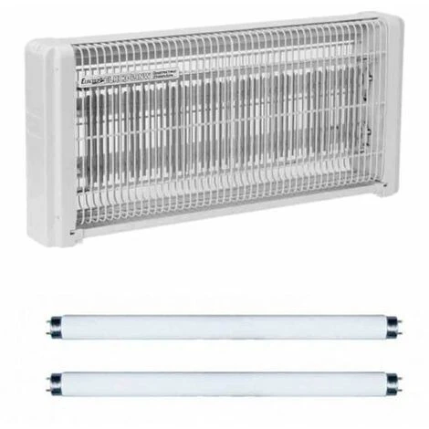 La lumière émise par les 2 tubes fluorescents attire les insectes vers la grille métallique haute tension (1800 V sous quelques mA) pour les foudroyer.