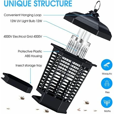 【Efficace et sûr】: La lampe anti-moustiques est équipée d’une lampe ultraviolette à haute intensité de 12 W, qui peut émettre une longueur d’onde de 365 nm pour attirer efficacement les insectes volants nuisibles tels que les moustiques, la haute tension de 4200 V tue instantanément, ne contient pas de substances chimiques et est sans danger pour bébés et animaux de compagnie. Les méthodes physiques tuent les moustiques, les mouches, les mites et autres insectes volants.