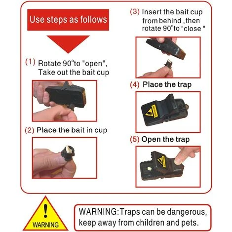 Facile Ă utiliser : retirez d’abord le rĂ©cipient Ă appâts du fond et placez le fromage Ă appât, la saucisse de foie, le bacon, la crème de nougat et le beurre de cacahuète sur le rĂ©cipient Ă appâts. Enfin, appuyez sur pour rĂ©initialiser le conteneur et maintenez la souricière. Étant donnĂ© que le piège ferme rapidement le conteneur d’appâts une fois que la souris a relâchĂ© le piège, le piège Ă souris attrape rapidement les souris.