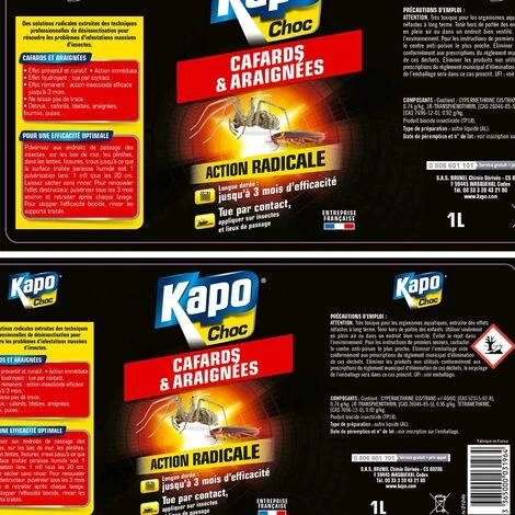 Le Kapo choc cafards et araignĂ©es est une formule Ă double action : curatif, il a un effet foudroyant et immĂ©diat. Il Ă©limine les cafards, blattes, araignĂ©es, fourmis, puces,… . Et prĂ©ventif, il a une action insecticide efficace et durable jusqu’Ă 3 mois. Il ne laisse pas de trace.