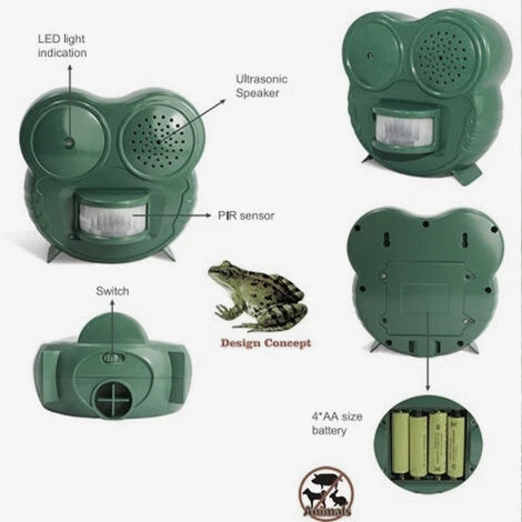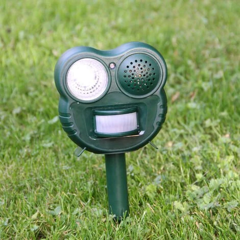 Repousse nuisibles audesign grenouille avec détecteur de présence. Ilémet des ultrassons pour repousser chauve-souris, pigeons,lapins, chats errants, rongeurs  et déclenche unflash avec ses LED durant la nuit